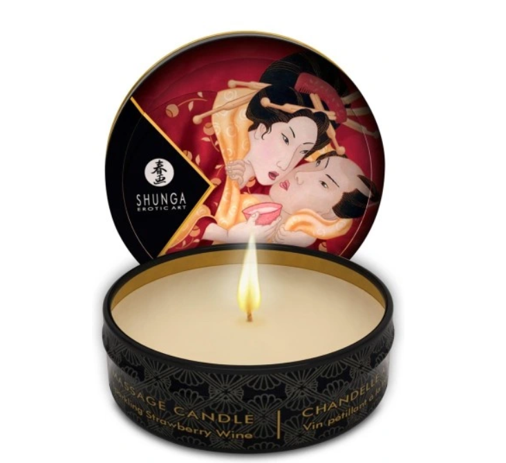 Prabangi „Shunga“ mini romantiška masažinė žvakė su subtiliu braškių ir putojančio vyno (šampano) aromatu, kuris uždegus maloniai pasklinda po kambarį. Žvakės vaškas ištirpsta ir virsta šiltu, maitinančiu masažo aliejumi, kurį galima tepti tiesiai ant odos. 100 % natūralūs aliejai maitina odą, suteikia jai švelnumo ir elastingumo, todėl masažas tampa ilgalaikis ir malonus.